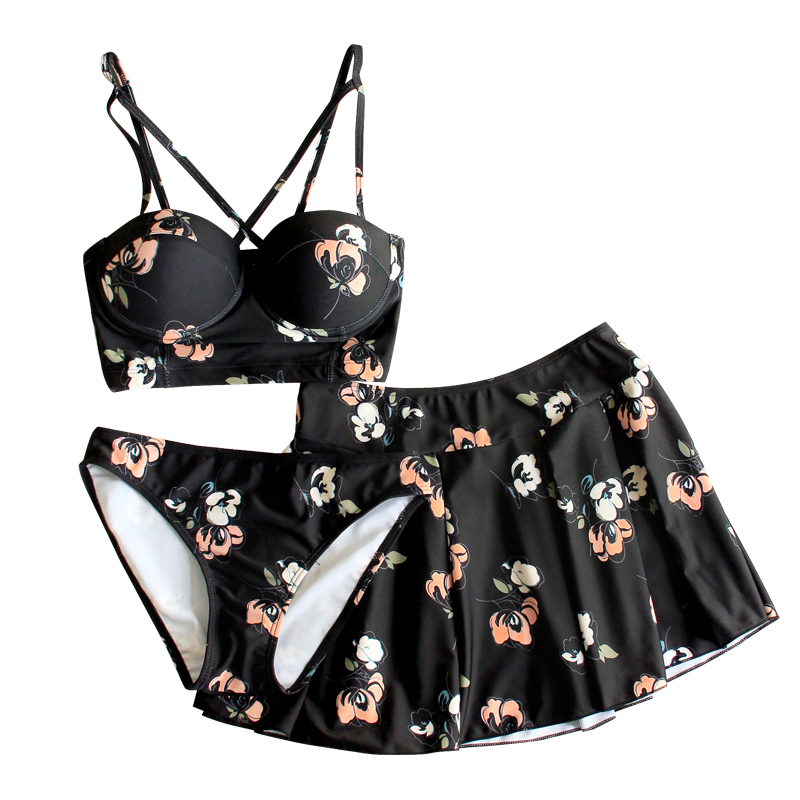 / 復古高腰泳衣女分體黑色裙式比基尼三件套鋼托聚攏溫泉泳裝bikini