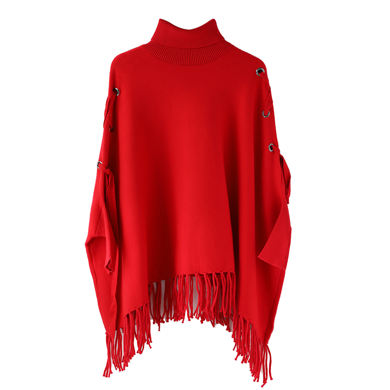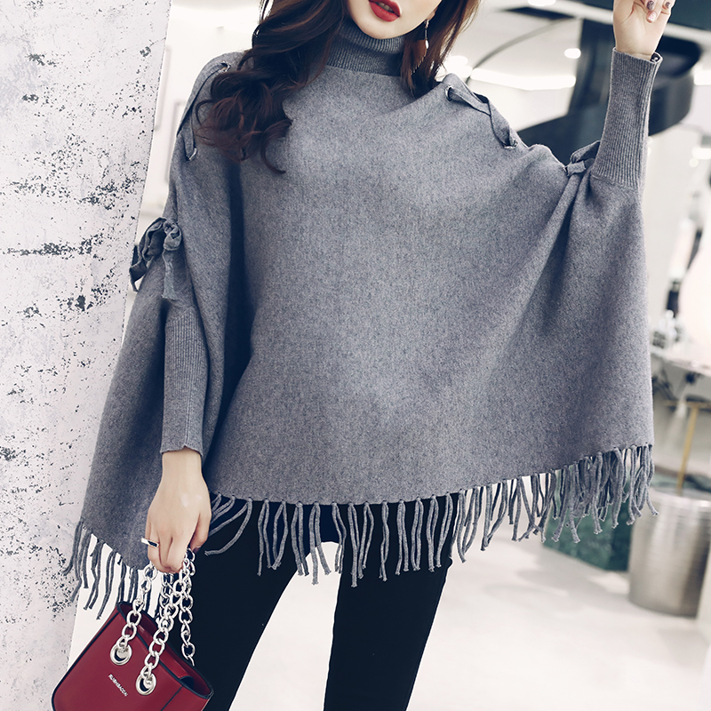 2018秋冬新款高領套頭寬松斗篷式披肩針織外套蝙蝠袖流蘇毛衣女裝