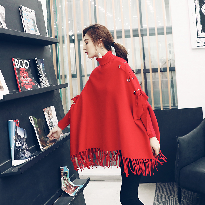 / 2018秋冬新款高領套頭寬松斗篷式披肩針織外套蝙蝠袖流蘇毛衣女裝