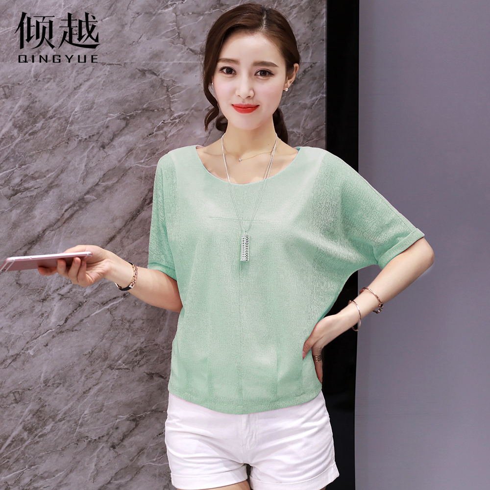 2017新款韓版圓領蝙蝠袖雪紡衫短袖女夏季純色大碼寬松顯瘦上衣女