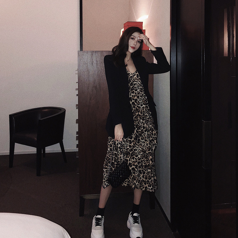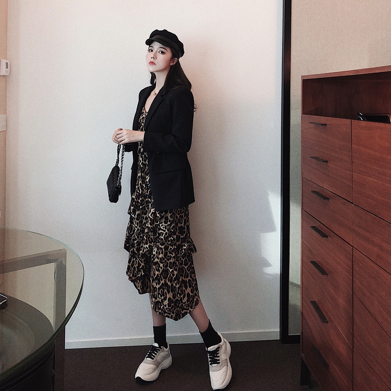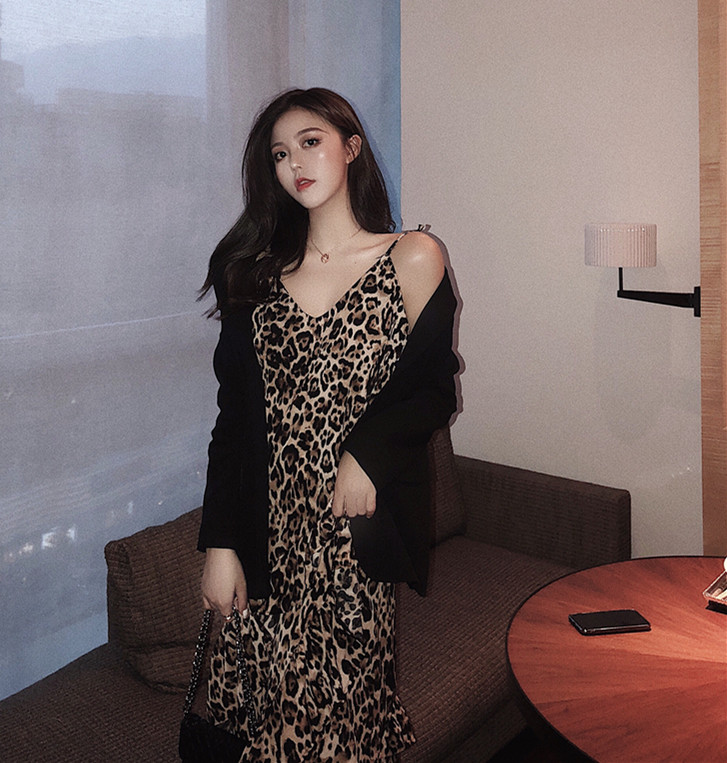 / 2018新款時髦不規則拼接百搭荷葉邊氣質時尚豹紋中長款吊帶連衣裙