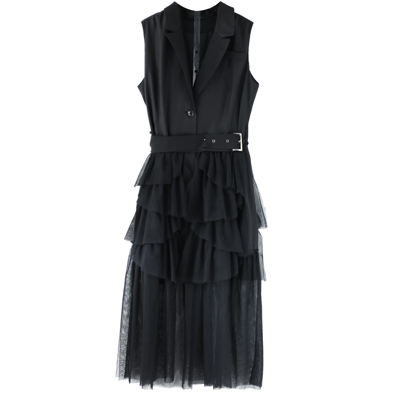 s秀名媛氣質2018新品職業OL無袖中長款蕾絲網紗拼接馬甲連衣裙潮