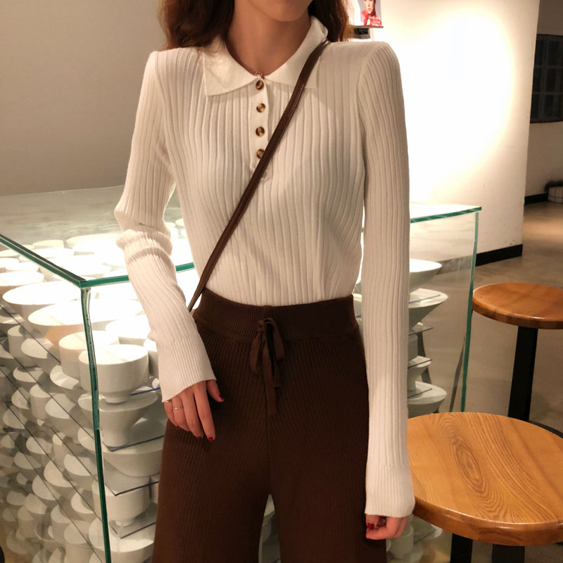 / chic秋季百搭韓國新款打底衫純色氣質時尚復古排扣翻領針織上衣女