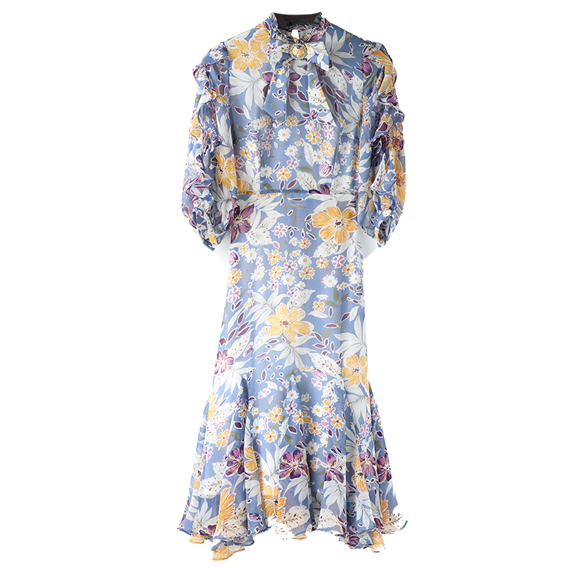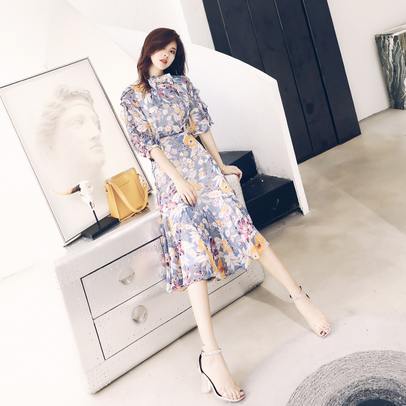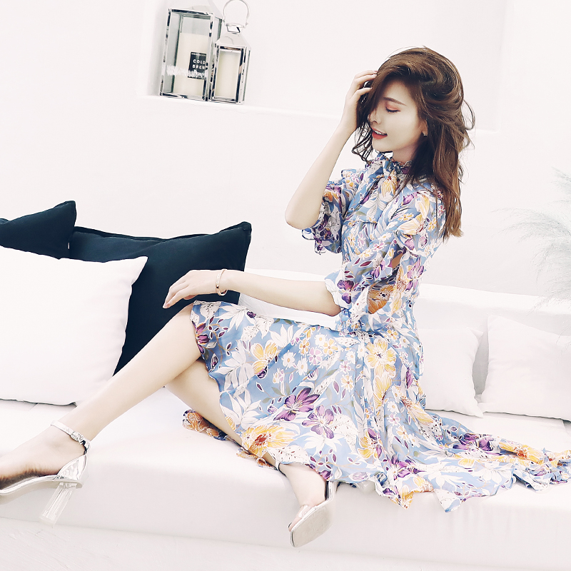 / 溫柔風中長款印花五分袖收腰荷葉邊連衣裙女夏2018新款碎花裙子潮