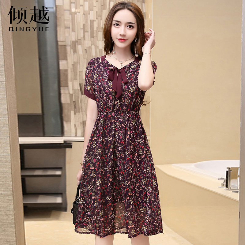 傾越碎花印花連衣裙女夏短袖蝴蝶結百褶a字裙2017春裝新款裙子潮