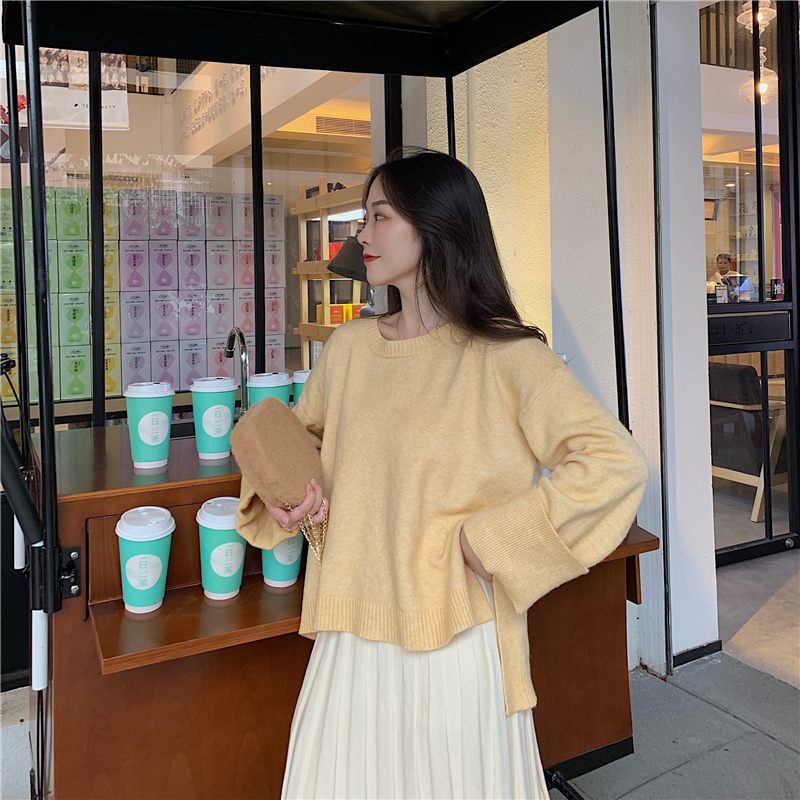 慵懶寬松毛衣套頭長袖針織衫上衣+中長款高腰百褶半身