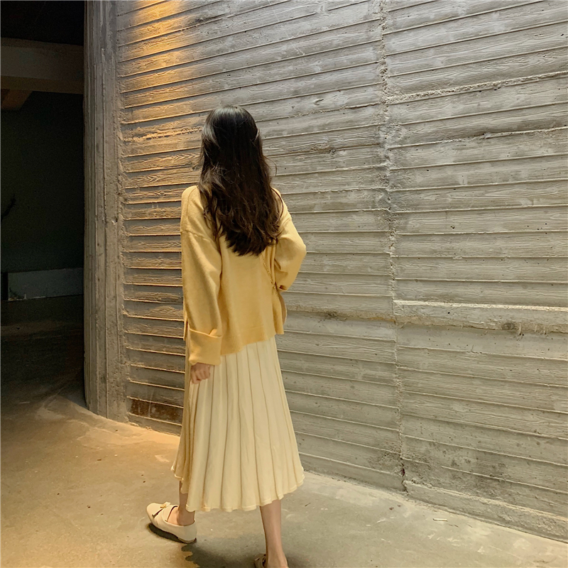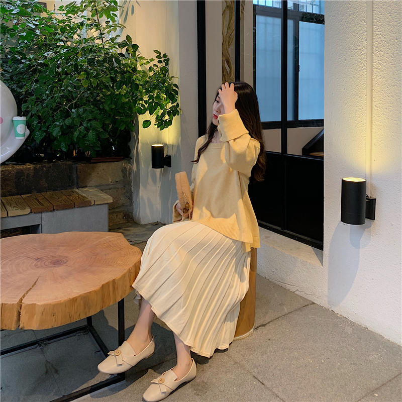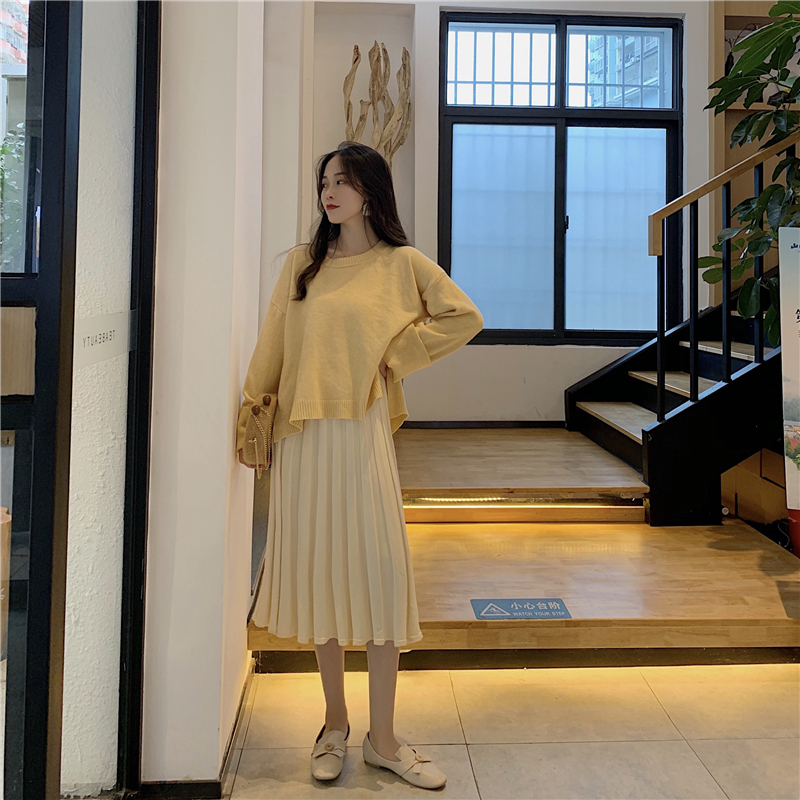 / 慵懶寬松毛衣套頭長袖針織衫上衣+中長款高腰百褶半身