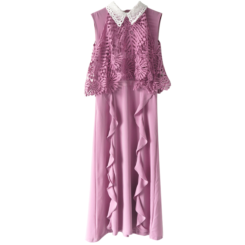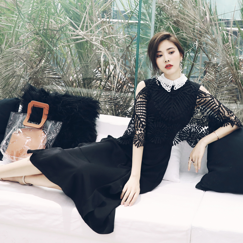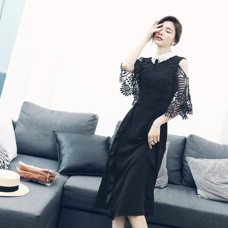 S秀甜美公主風2018夏季新款娃娃領純色蝴蝶結荷葉邊鏤空鉛筆裙