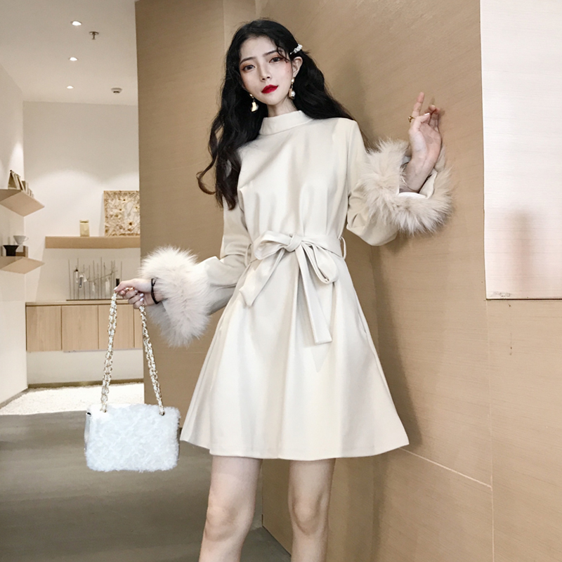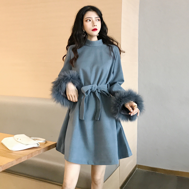 / 連衣裙女秋冬新款修身顯瘦加厚系帶收腰毛絨袖口中長款呢子半身裙