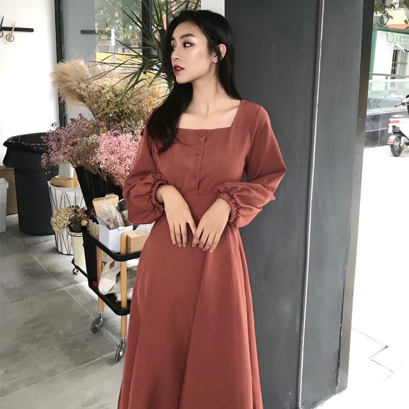 / 2018新款韓范復古百搭時尚中長款收腰長袖連衣裙方領燈籠袖A字裙