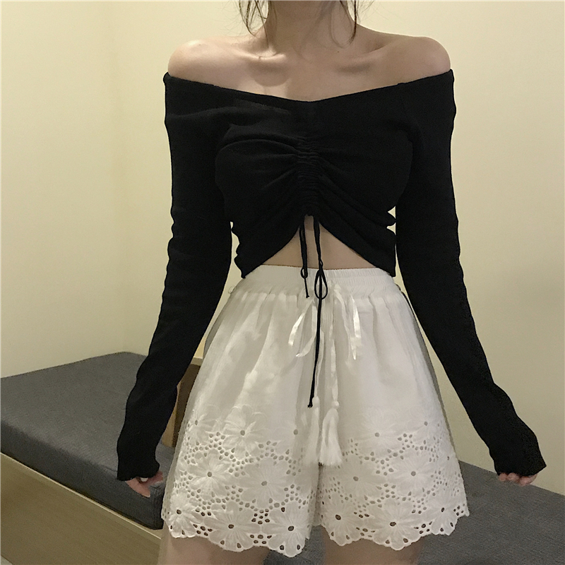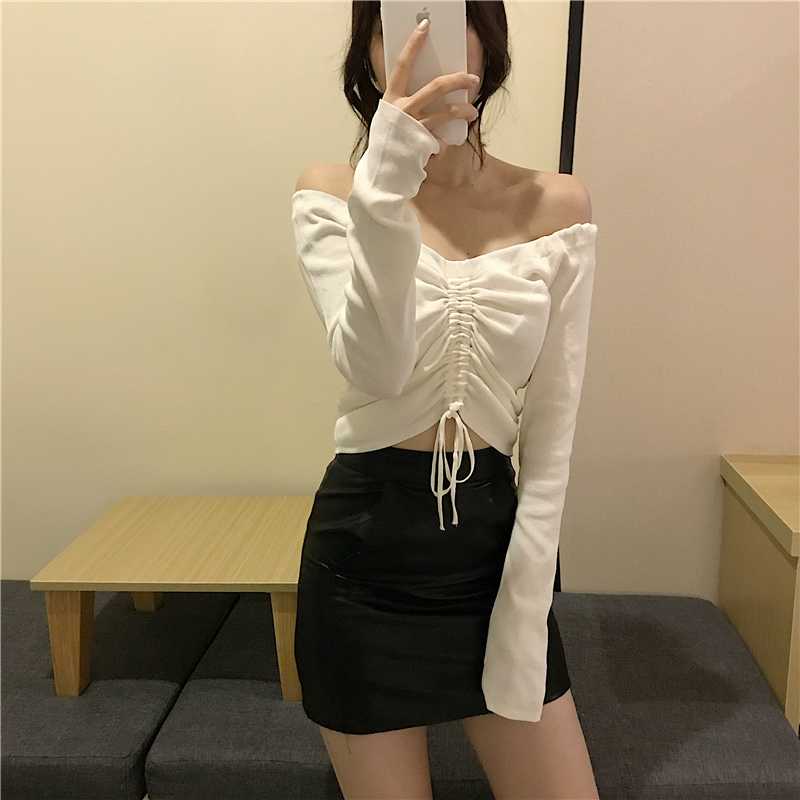 / 港味2018新款復古純色一字領露肩上衣小心機抽繩系帶長袖針織衫女
