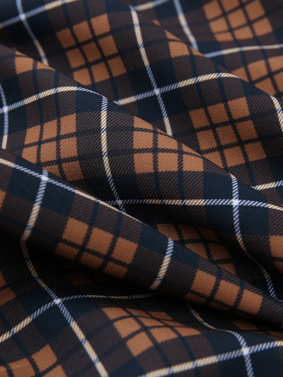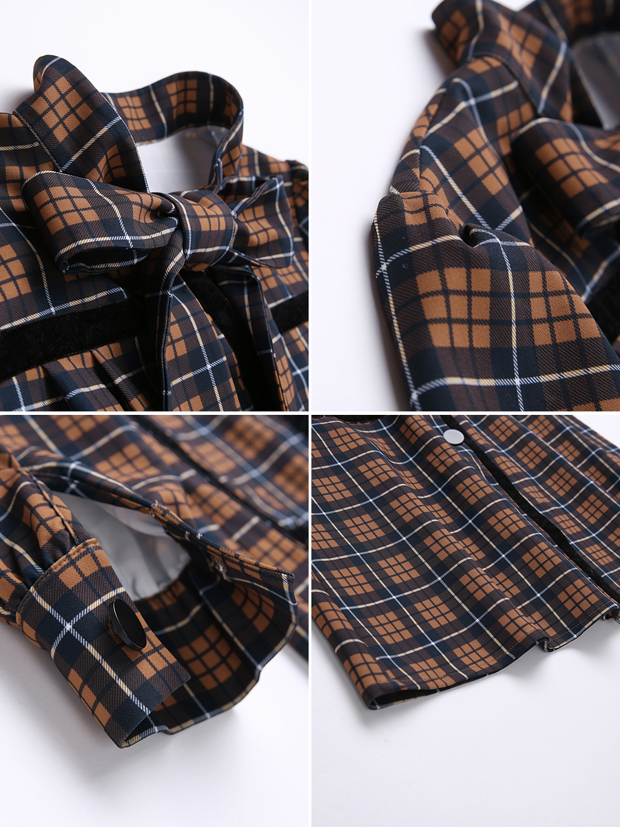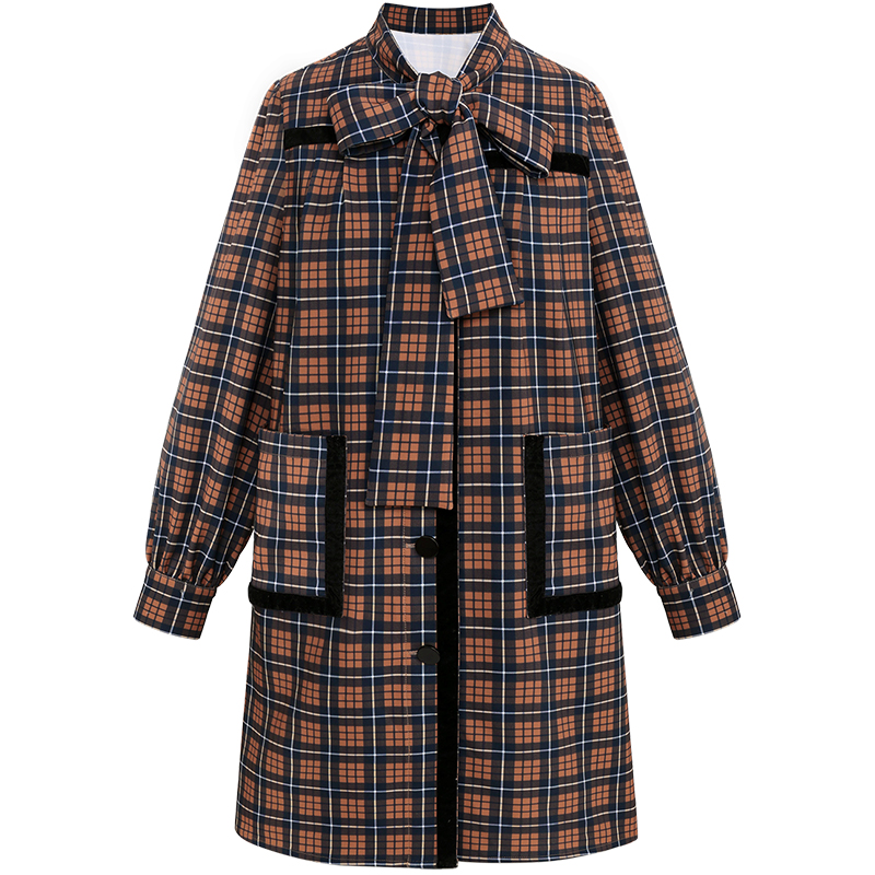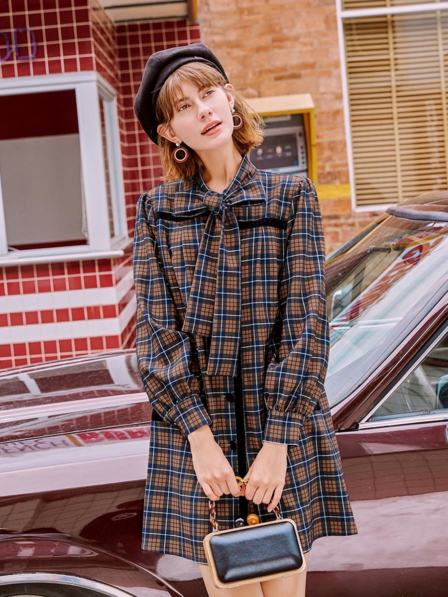 MG小象格子長袖連衣裙女秋冬裝2018新款成熟氣質蝴蝶結復古裙子潮
