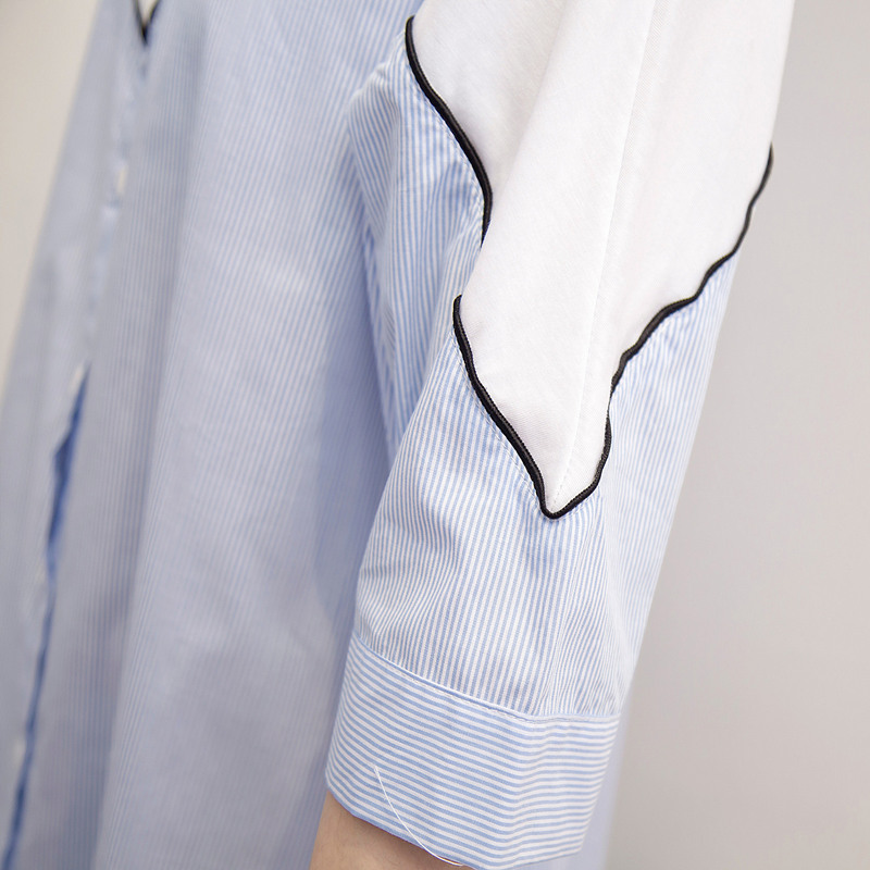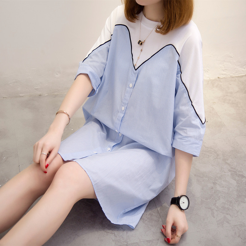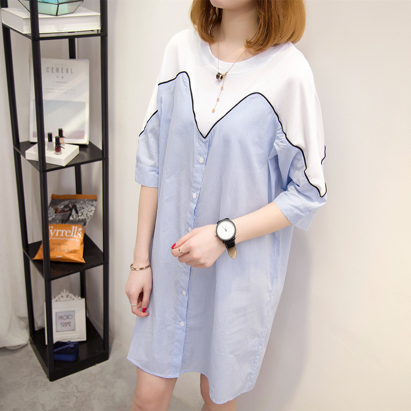 中長款襯衫女韓范短袖寬松百搭學生上衣夏裝新款潮豎條紋襯衣