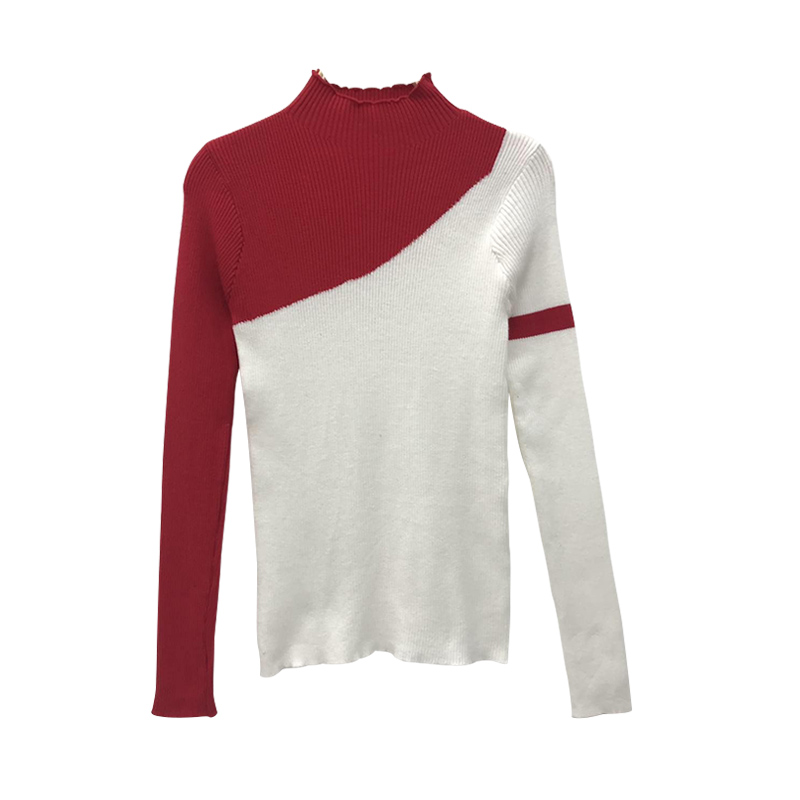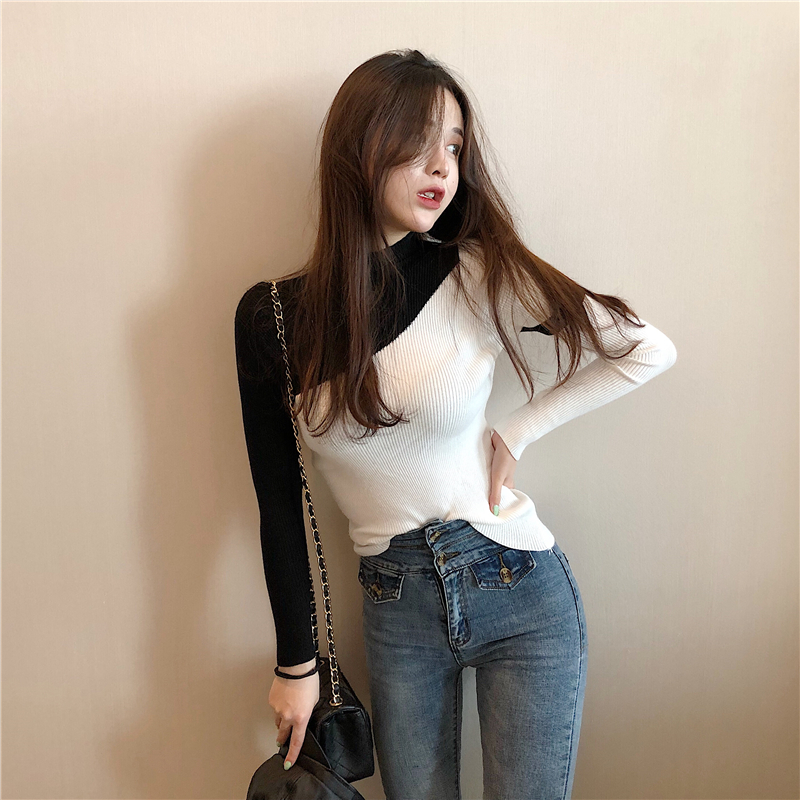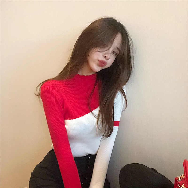 / 2018韓風新款長袖拼色修身百搭打底毛衣針織衫減齡時尚撞色上衣女