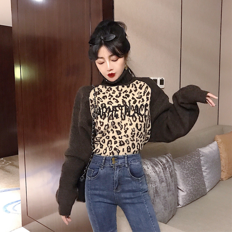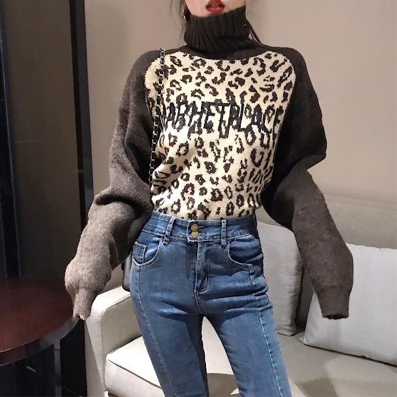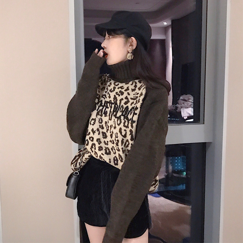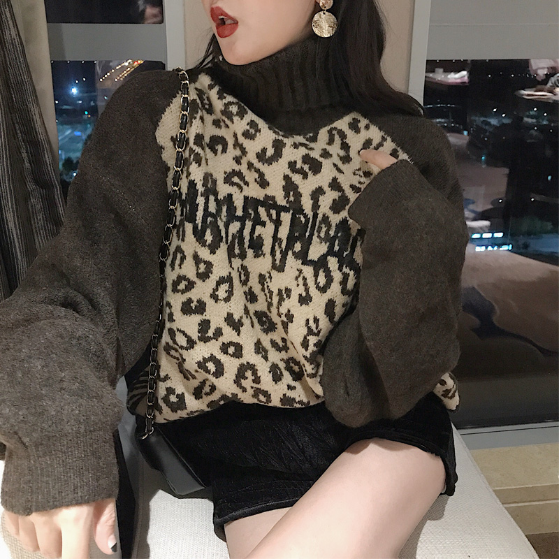 2018新款韓版秋冬季chic毛衣女裝高領豹紋拼接長袖套頭寬松針織衫