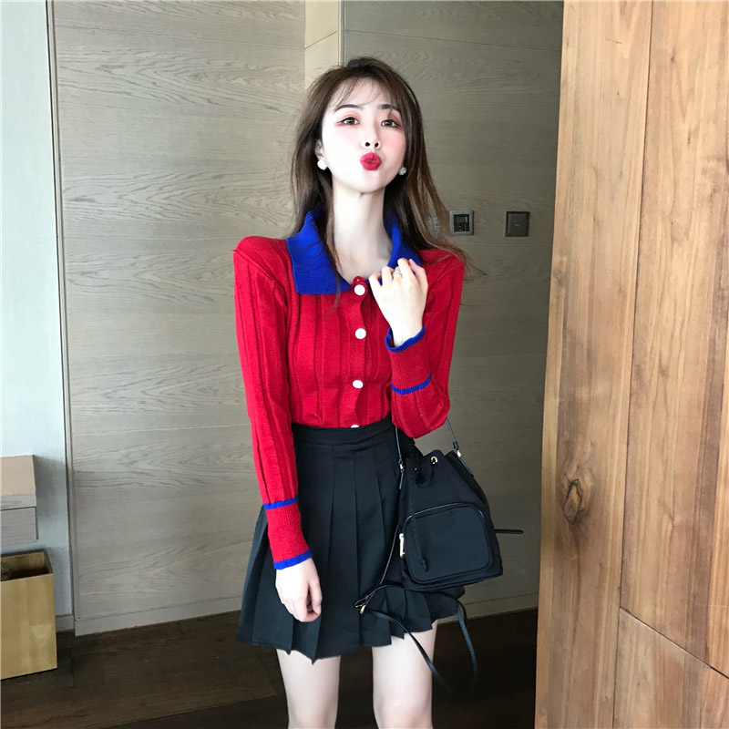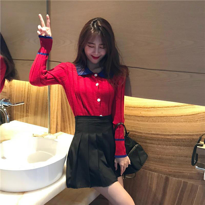 2018秋裝新款時尚套裝Chic撞色翻領慵懶風針織開衫百褶半身短裙女