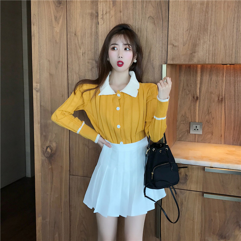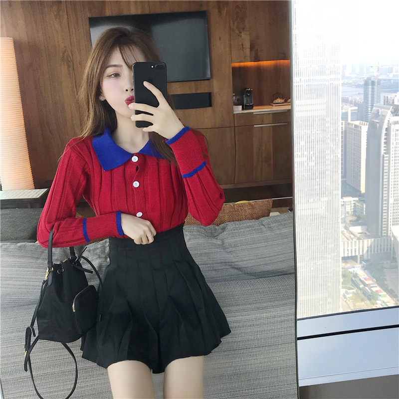 / 2018秋裝新款時尚套裝Chic撞色翻領慵懶風針織開衫百褶半身短裙女