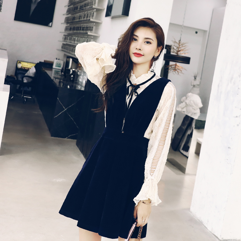 絲絨連衣裙女秋2018新款氣質優雅背心裙小個子蕾絲上衣兩件套裝裙