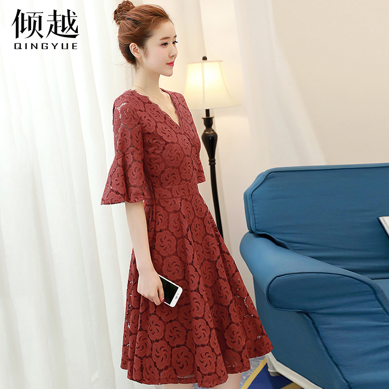 / 傾越2017新款夏季韓版修身A字裙大碼V領短袖喇叭袖蕾絲連衣裙女裙