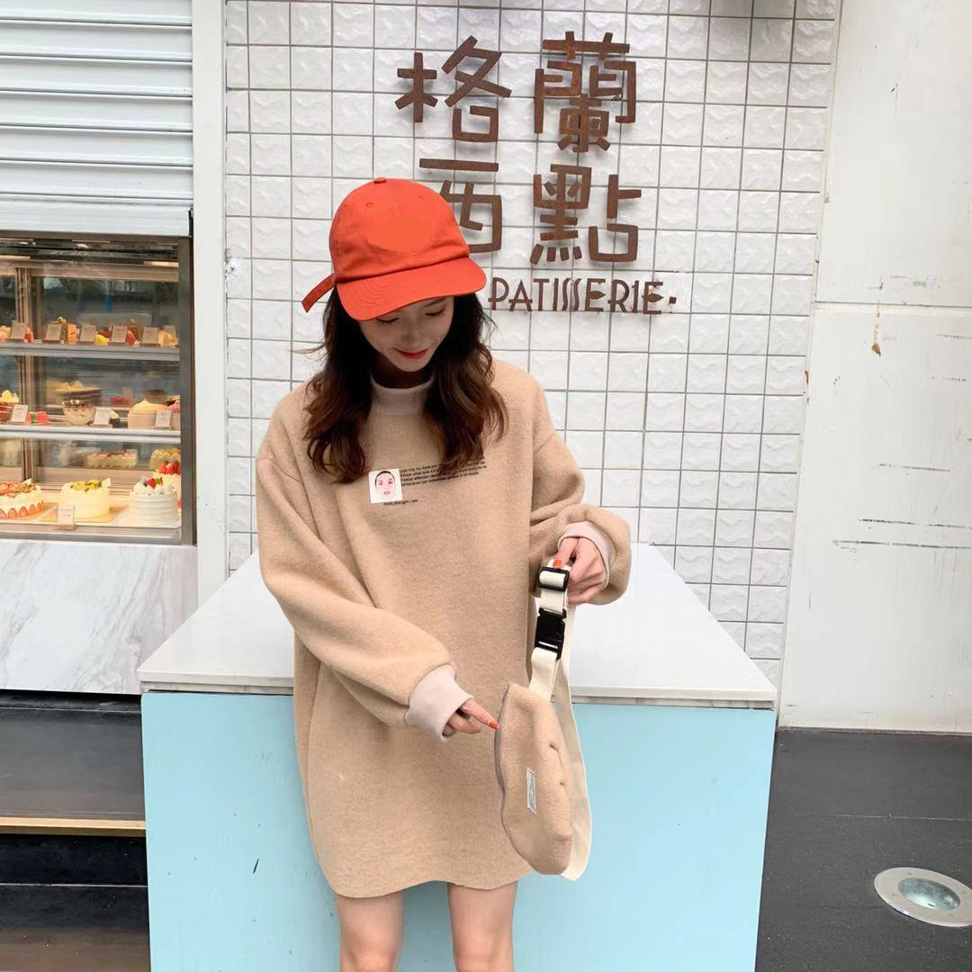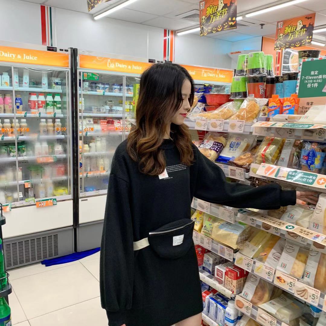 / 秋冬女裝寬松顯瘦字母印花半高領中長款百搭衛衣針織裙配個性挎包