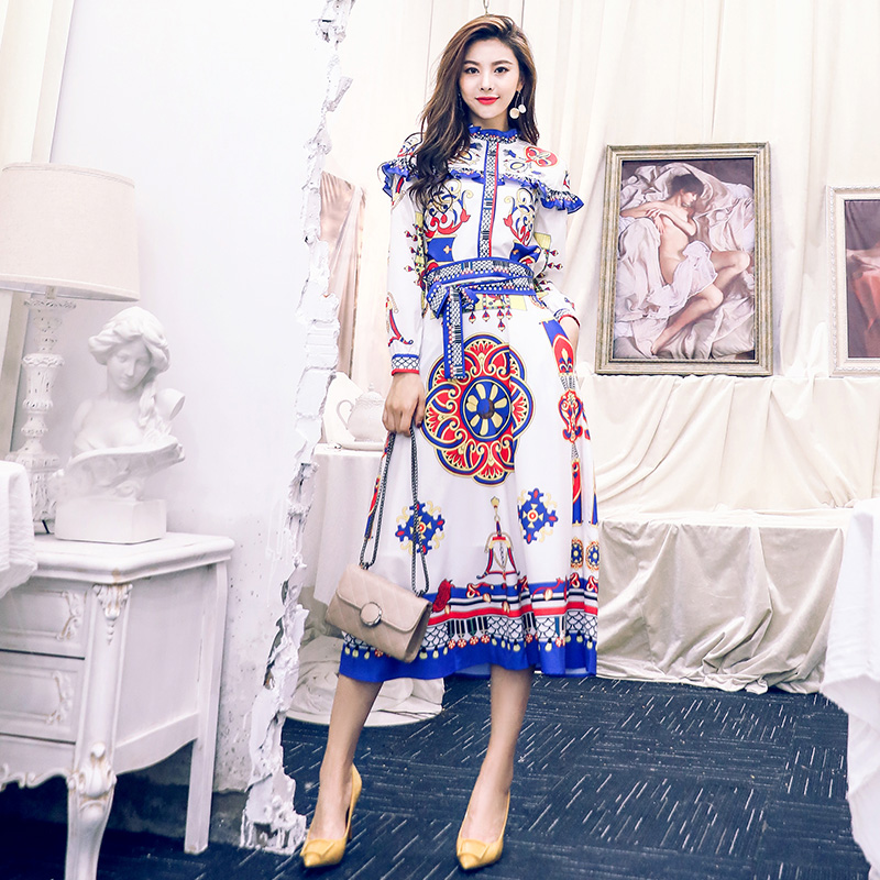 / 名媛氣質2018秋新款時髦襯衫高腰顯瘦洋氣復古印花裙子長款連衣裙