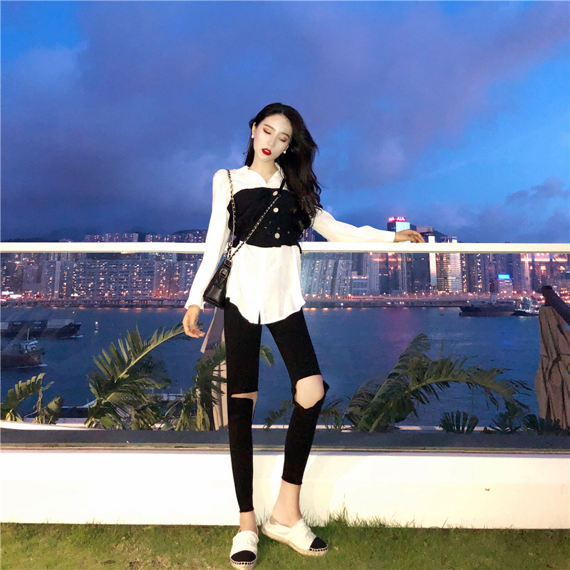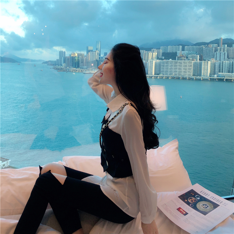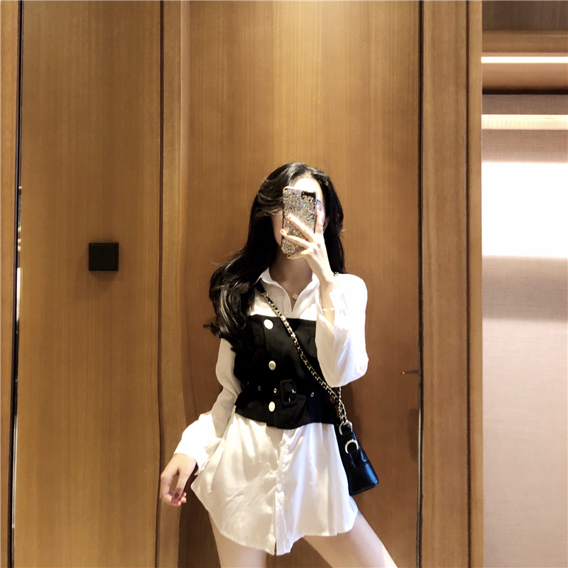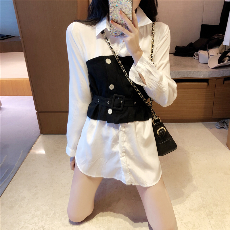 / 韓范百搭撞色設計感新款秋季上衣中長款chic個性系帶收腰襯衫女裝