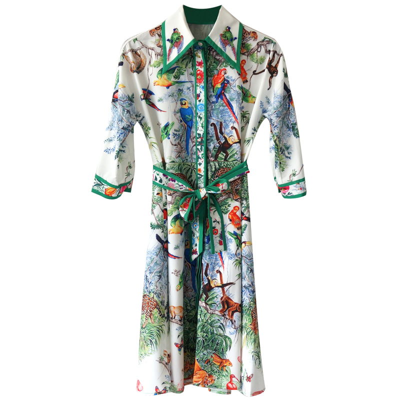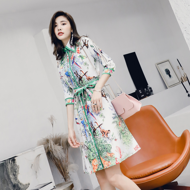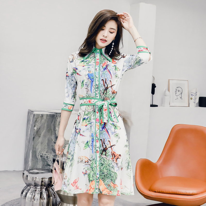 / 名媛淑女雪紡印花翻領襯衫式釘珠時尚中長連衣裙女夏2018新款裙子