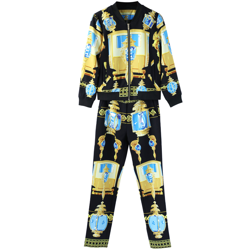 / 港味休閑兩件套2018秋裝新款個性印花長袖夾克九分小腳褲運動套裝