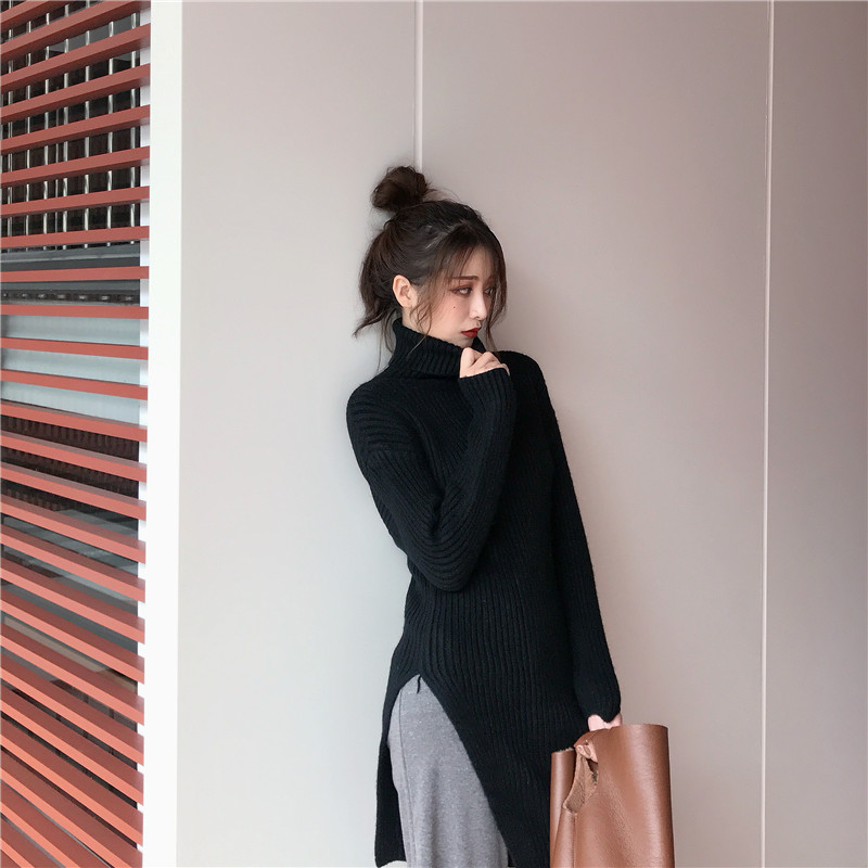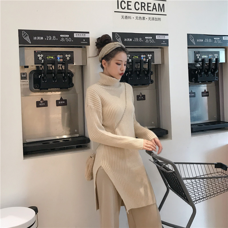 慵懶高領針織開叉毛衣時尚套裝純色休閑褲闊腿褲長褲chic兩件套女