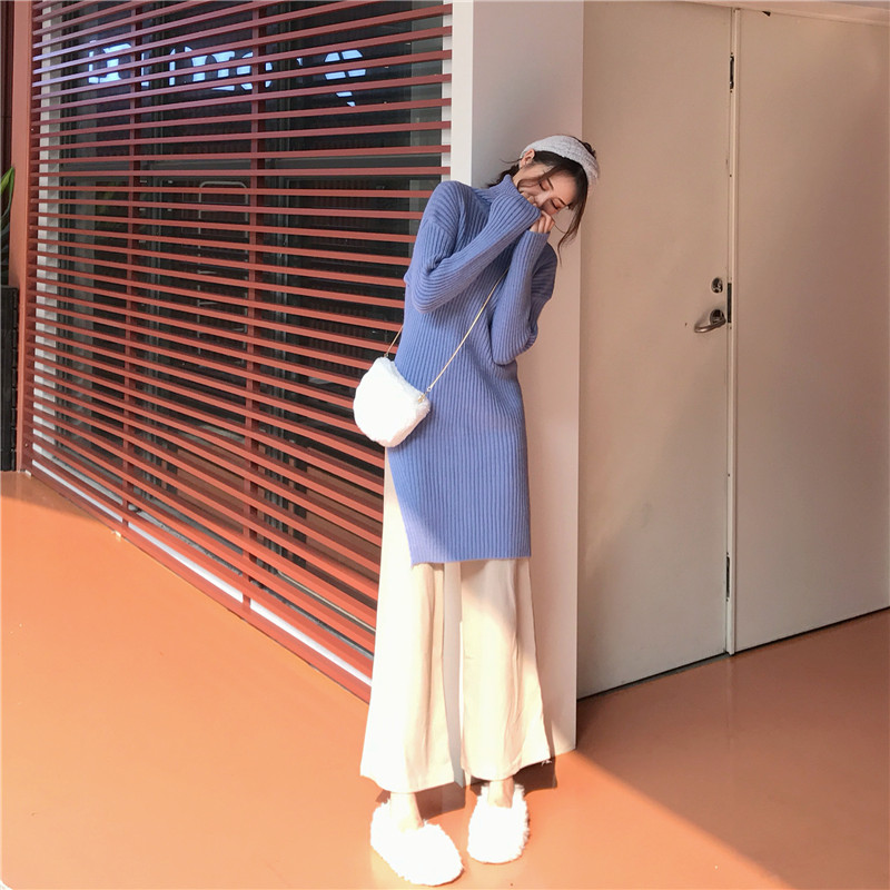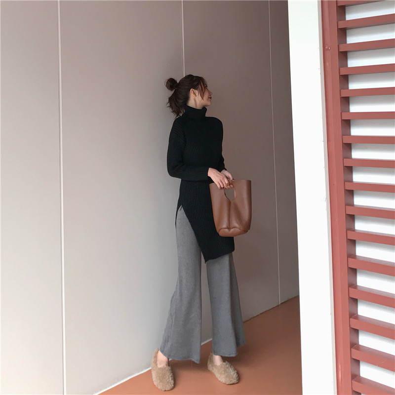 / 慵懶高領針織開叉毛衣時尚套裝純色休閑褲闊腿褲長褲chic兩件套女