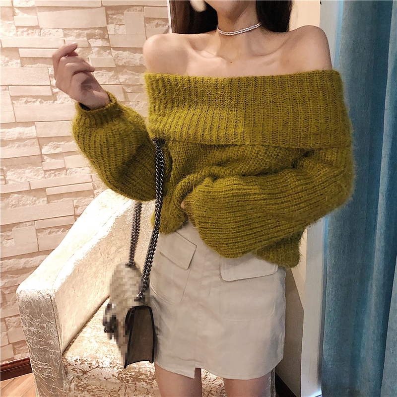 2018新款韓版毛衣女性感露肩一字肩大翻領針織衫加厚寬松打底上衣