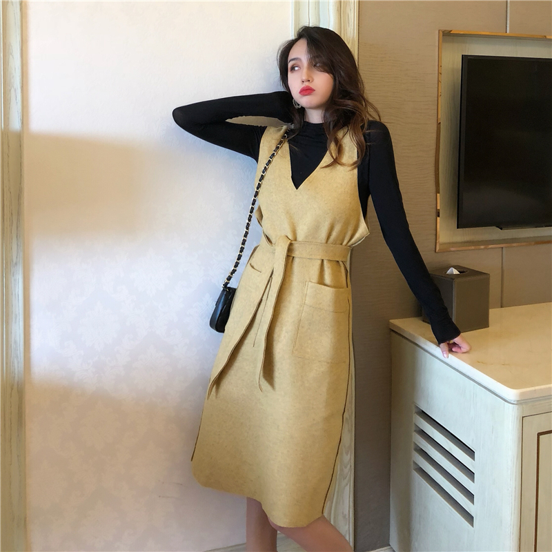 新品毛呢口袋系帶背心連衣裙+簡約純色高領長袖打底衫百搭上衣女