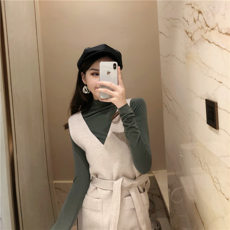 / 新品毛呢口袋系帶背心連衣裙+簡約純色高領長袖打底衫百搭上衣女