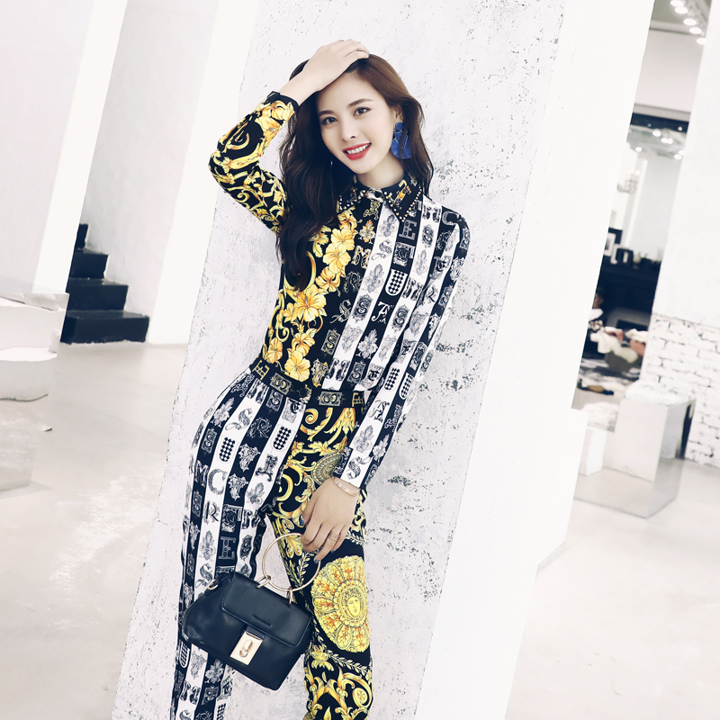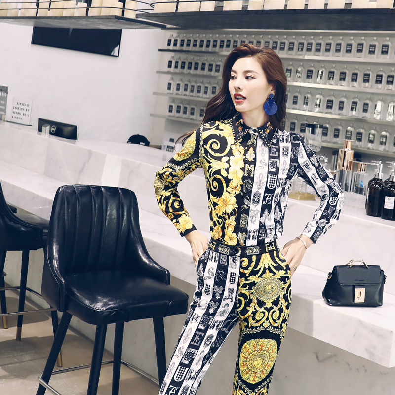 2018秋季套裝長袖印花襯衫高腰修身九分小腳褲時髦時尚兩件套女潮