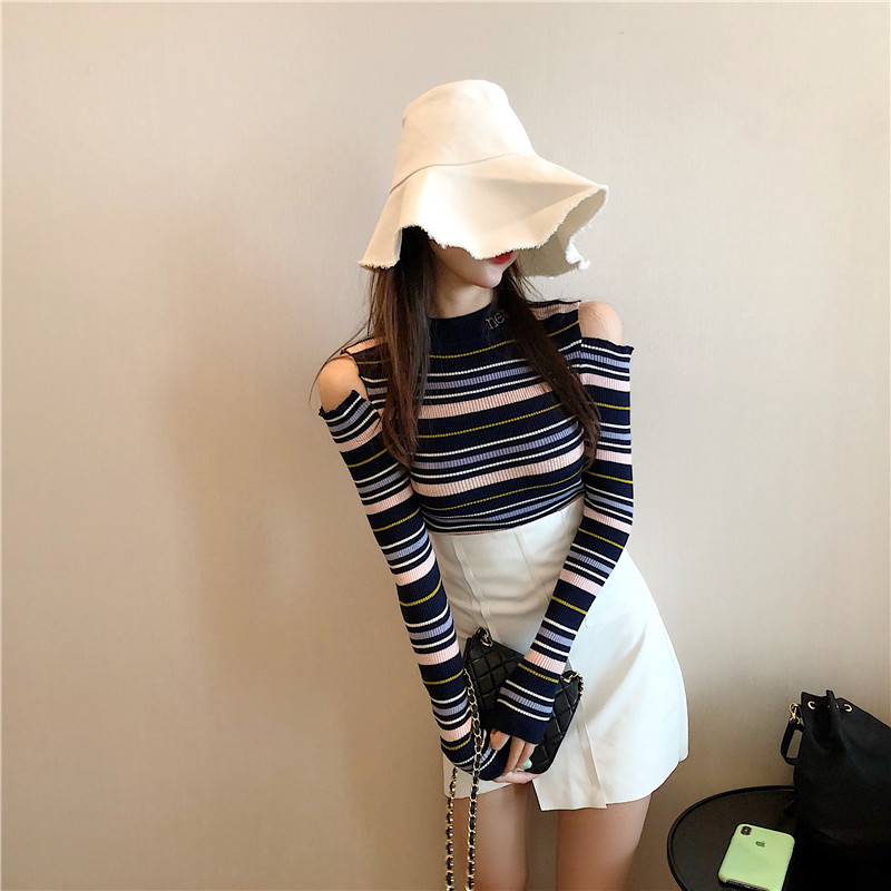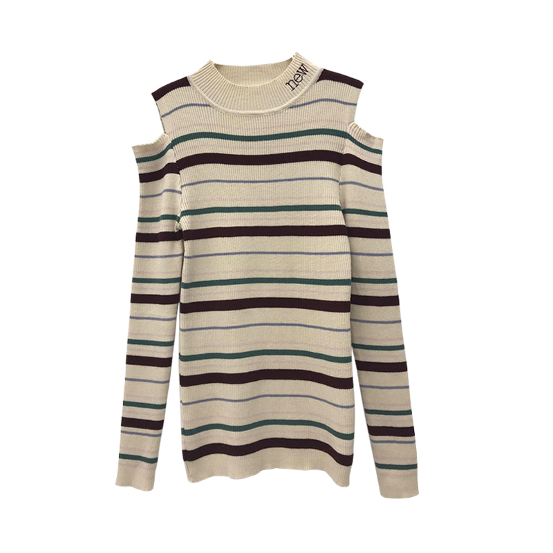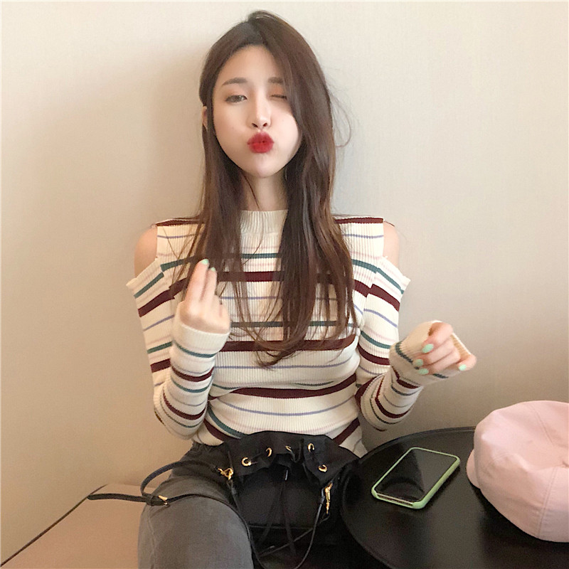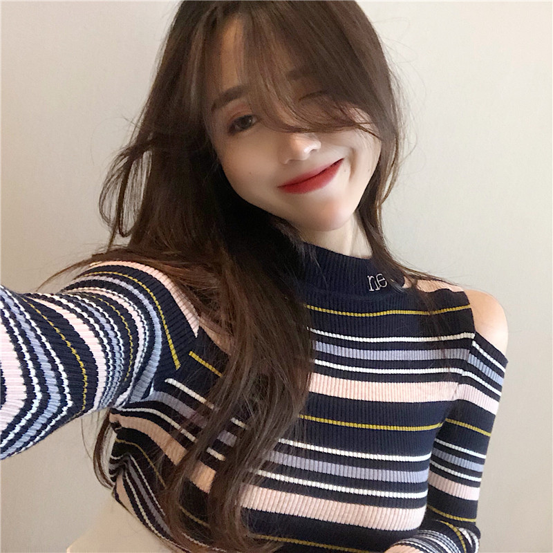 chic早秋上衣女新款韓版打底衫修身顯瘦復古露肩半高領條紋針織衫