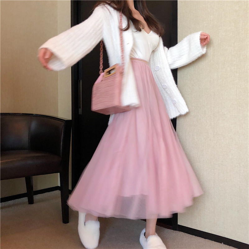 寬松白色網紅毛衣甜美小清新開衫韓版時尚套裝網紗裙子chic兩件套