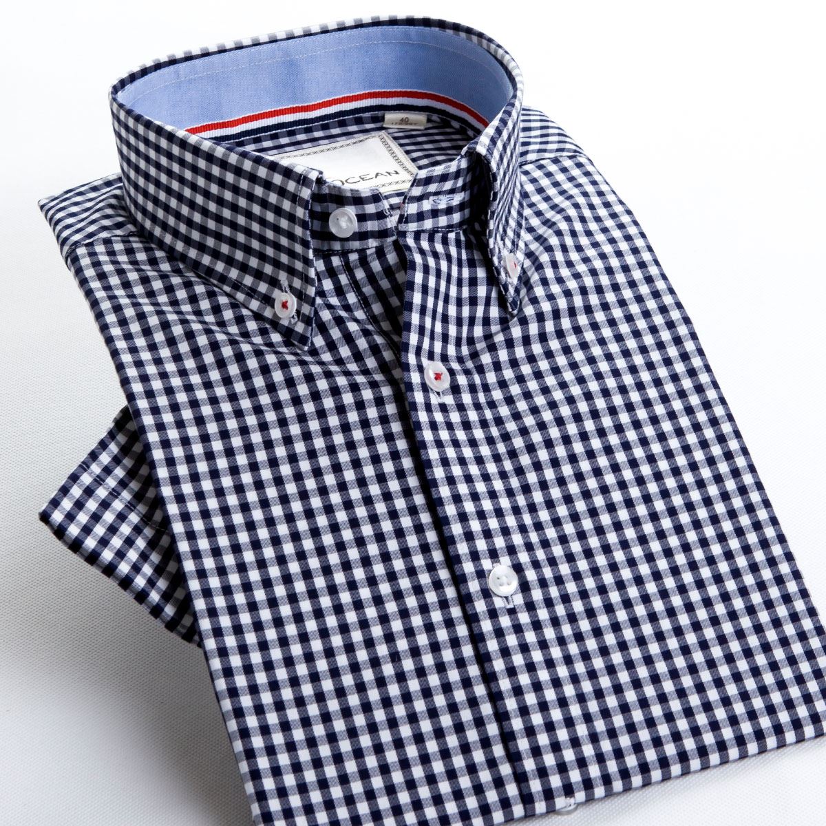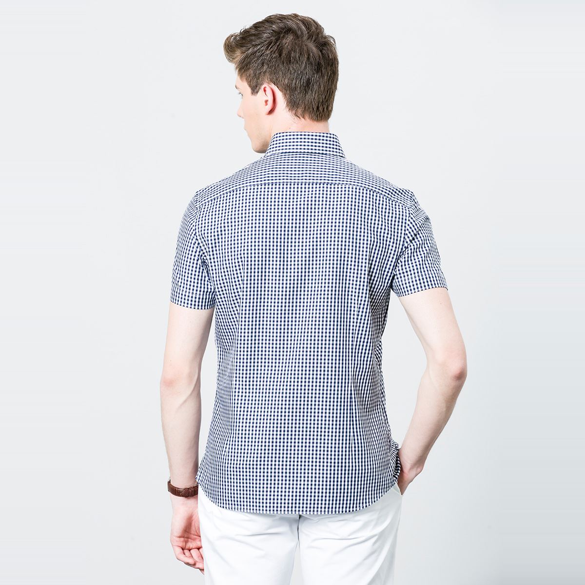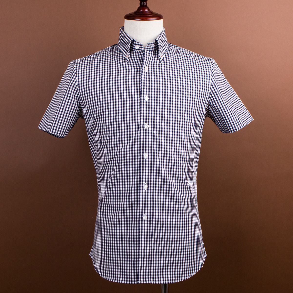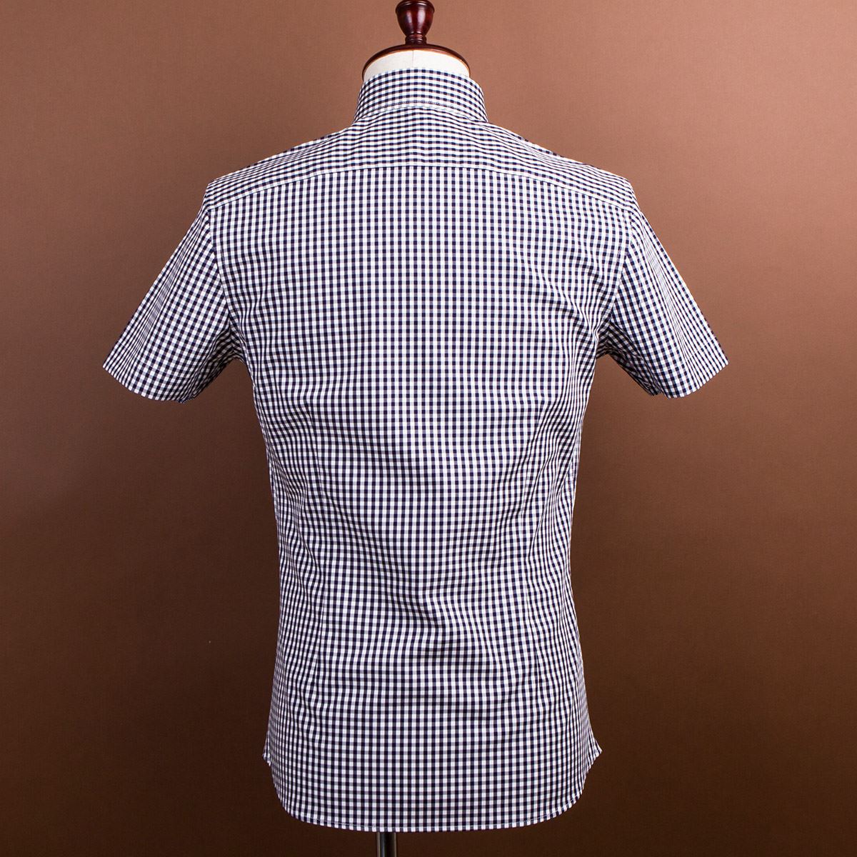 / 夏季新款短袖襯衫男士藍黑間白細格子中年紳士薄款純棉深海襯衣