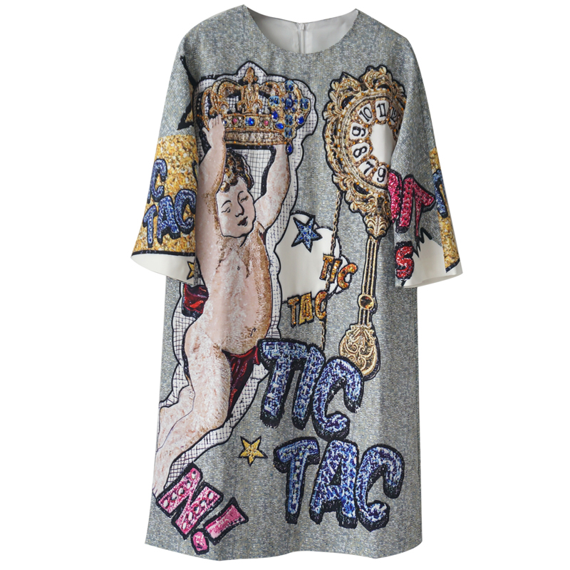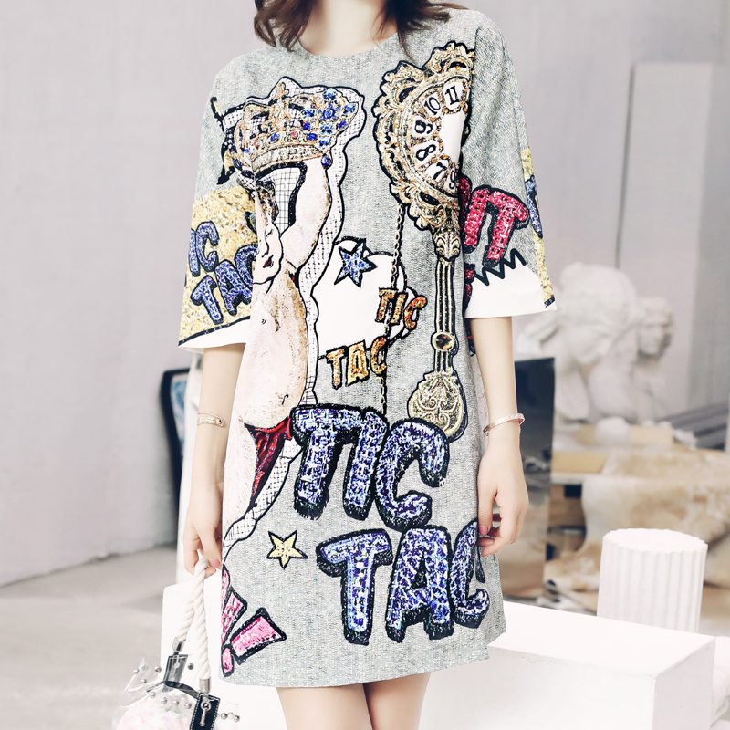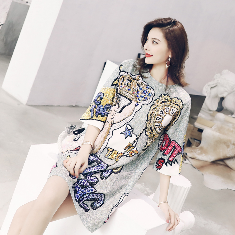 / 2018夏裝新款時尚五分袖復古重工釘珠印花T恤女韓版寬松中長款裙