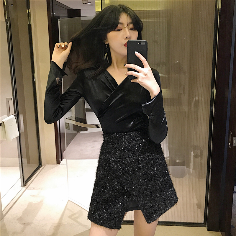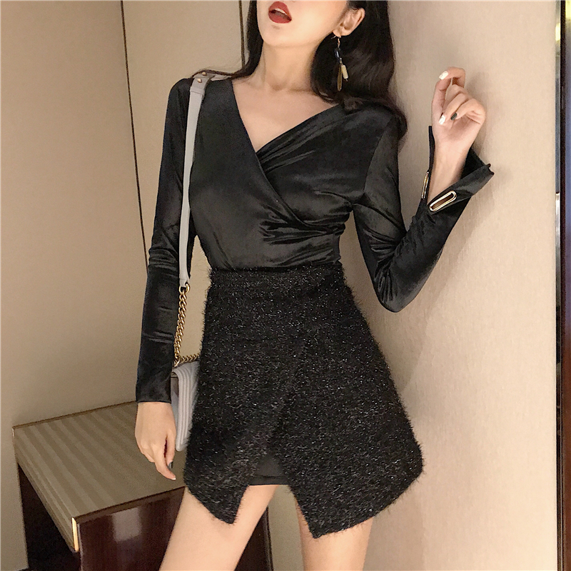 / 時尚新款性感套裝女顯瘦不規則半身裙氣質修身V領打底衫兩件套秋