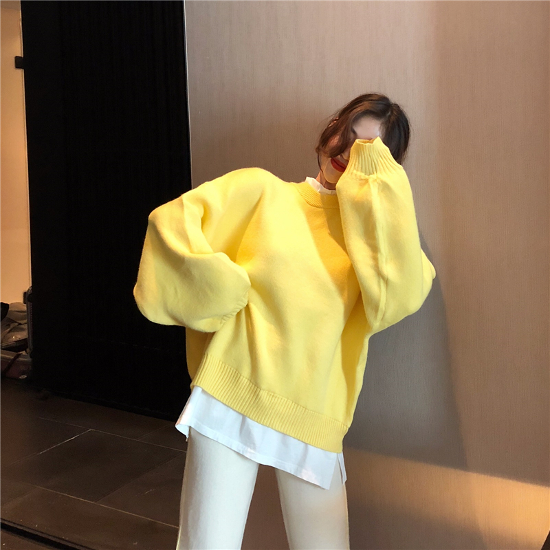 新款秋冬燈籠袖假兩件拼接毛衣時尚套裝撞色復合寬松蘿卜褲兩件套