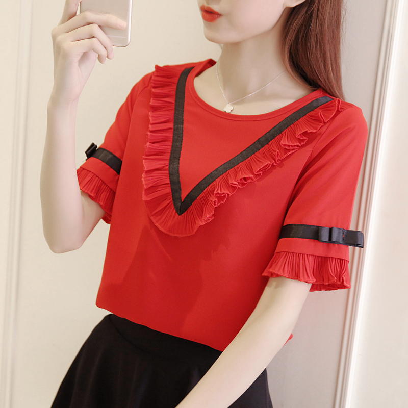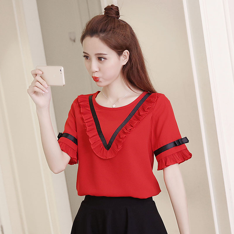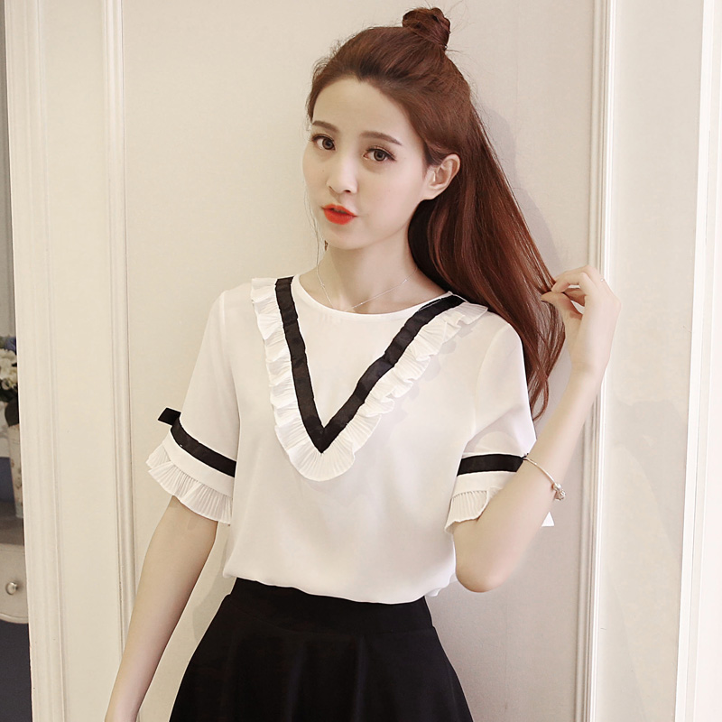 / 夏裝新款小清新女裝短袖雪紡衫女圓領韓版甜美木耳邊襯衫上衣