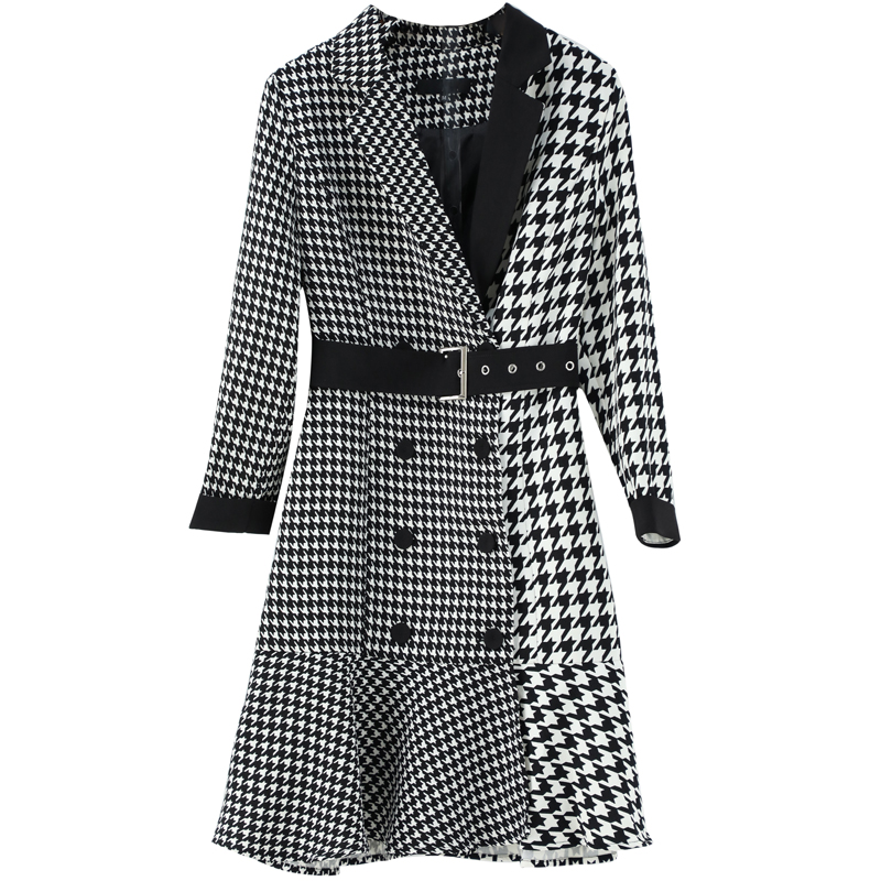 / 名媛氣質初秋裙裝不對稱長袖格子拼接系帶修身收腰中長款連衣裙