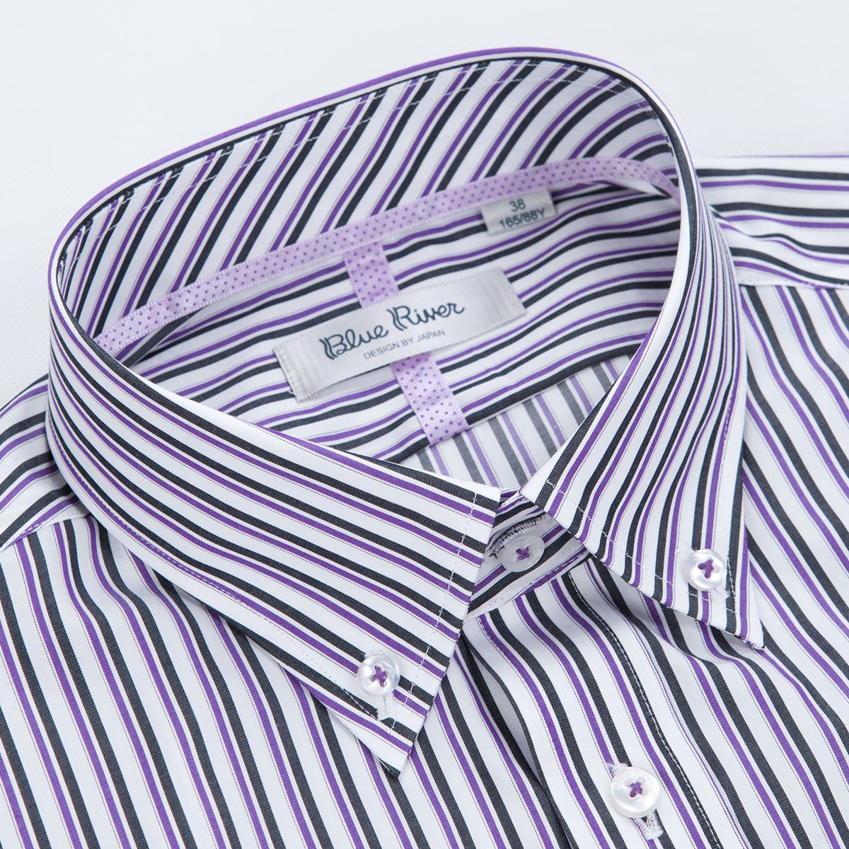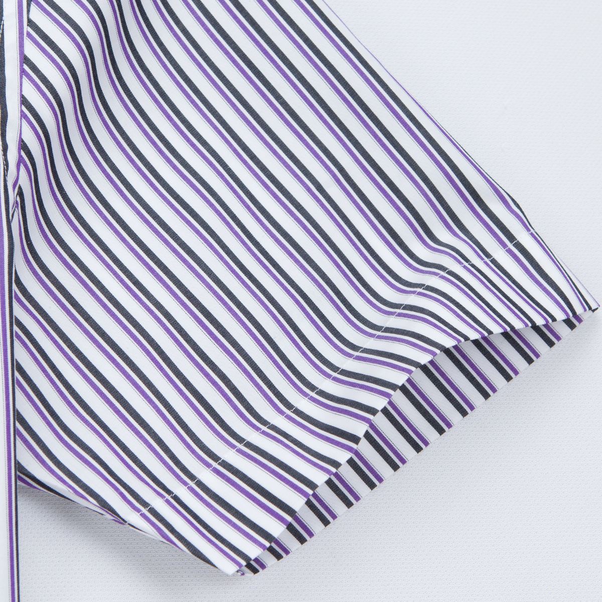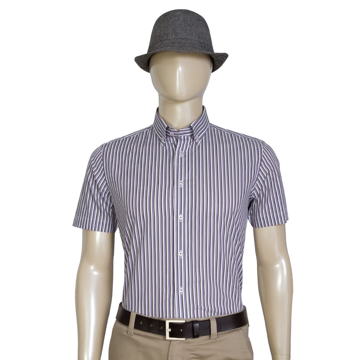 / 藍河夏裝新款男士休閑短袖襯衫修身時尚商務紳士紫色條紋純棉襯衣