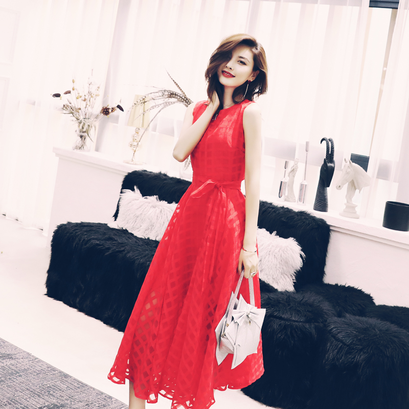 夏季連衣裙女2018新款氣質修身公主裙紅色高腰蓬蓬蝴蝶結大擺裙子