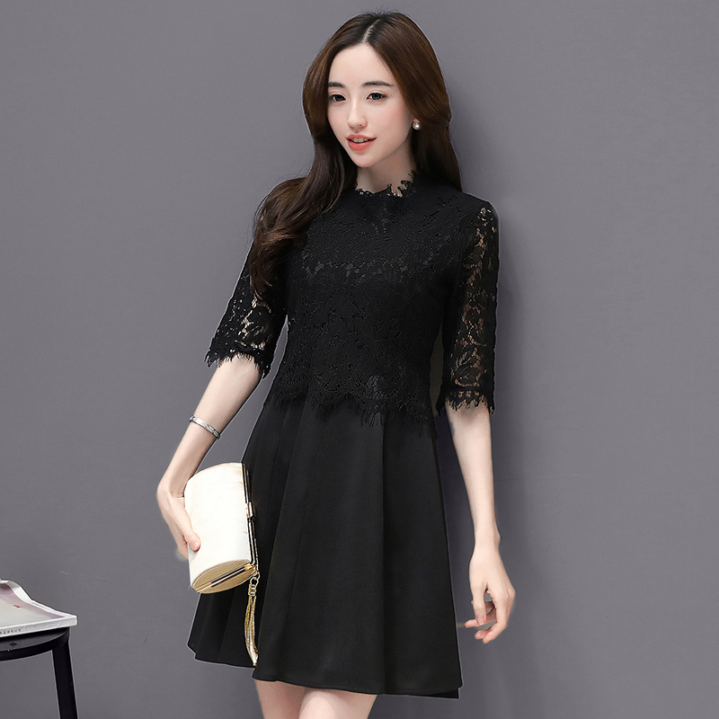 / 春季新款中裙五分袖蕾絲薄款時尚修身顯瘦假兩件打底連衣裙女