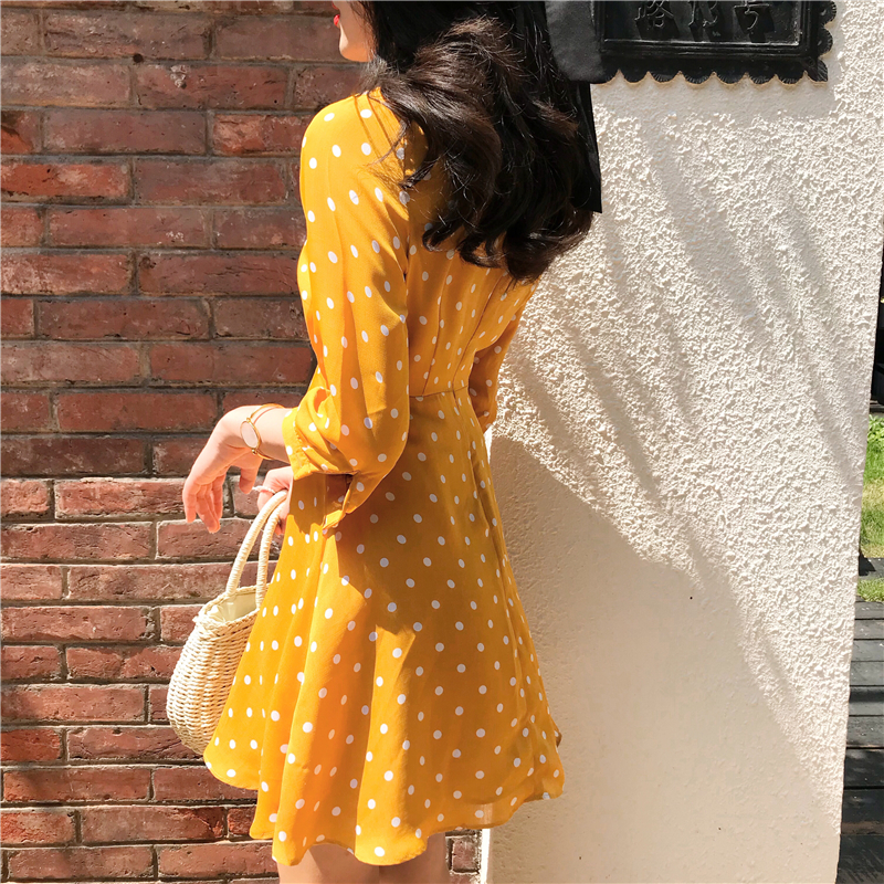 復古chic收腰顯瘦百搭新款韓國短裙V領高腰A字波點圓點雪紡連衣裙
