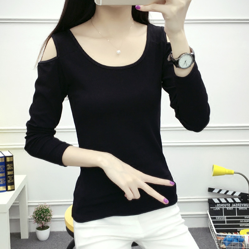 / 春秋新款純色棉質體恤衫大碼顯瘦修身彈力長袖T恤女打底衫