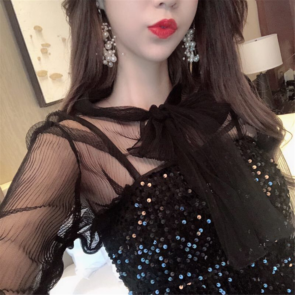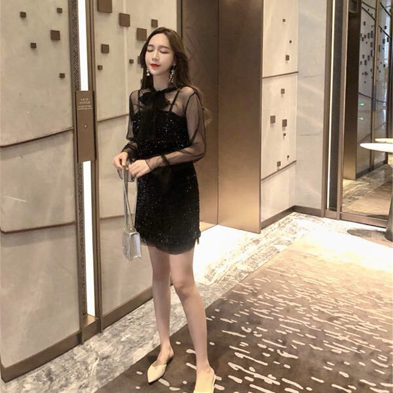 / 秋季新款韓版女神范亮片氣質名媛兩件套吊帶連衣裙網紗裙時尚套裝