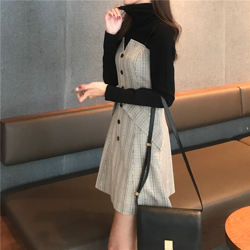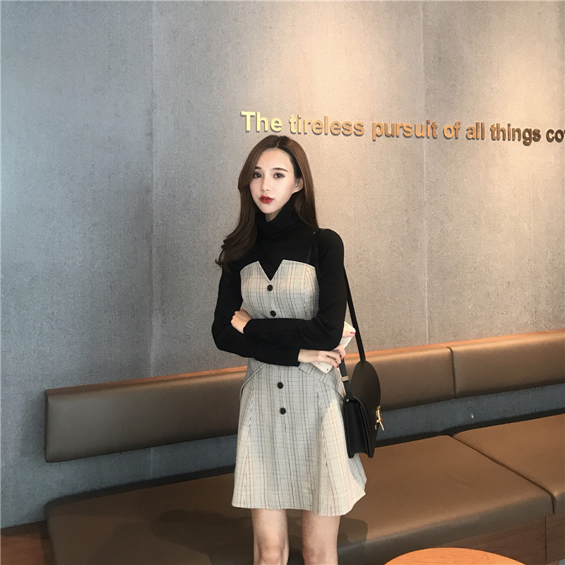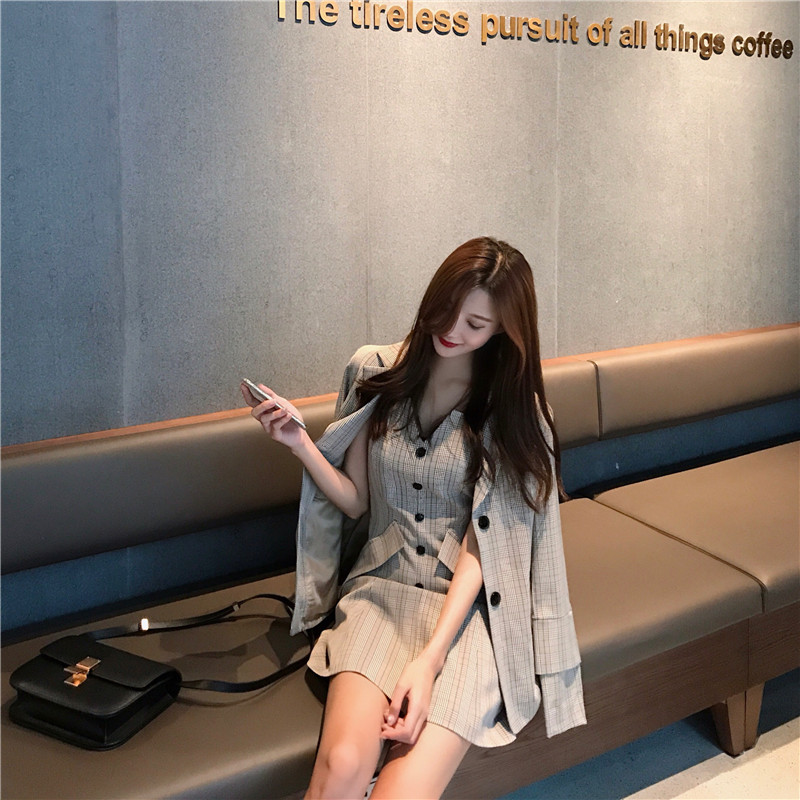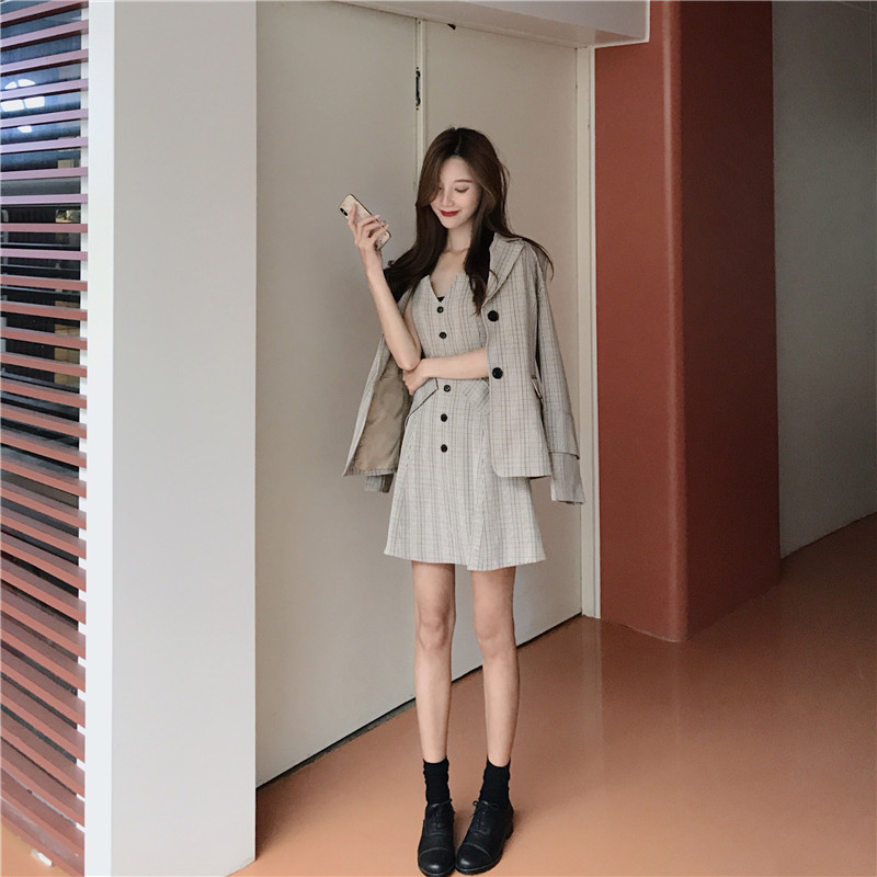 秋裝女2018新款英倫風格紋小西裝+吊帶連衣裙+配磨毛打底三件套女