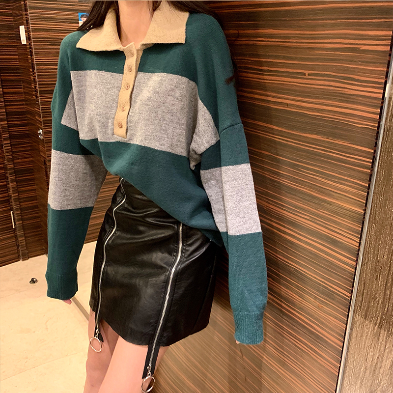 / 港味chic秋冬POLO領長袖條紋拼色T恤女潮寬松顯瘦長袖時尚打底衫